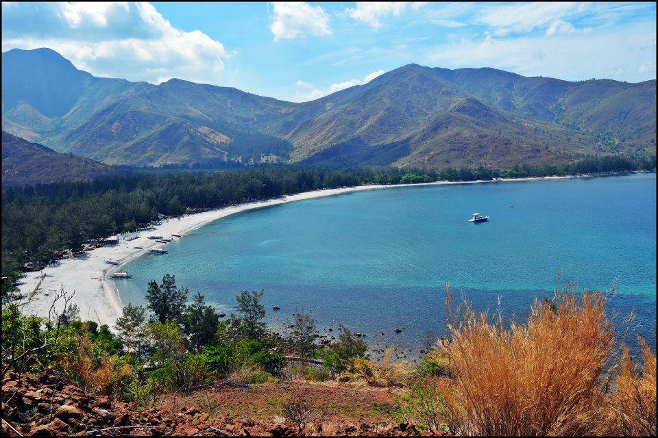 Campers set up tents on this remote, sandy beach in a tranquil cove with rustic cottages for rent.